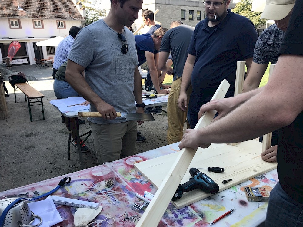 Sicherlich hat jeder von uns als Kind schon einmal mit einer Steinschleuder gespielt. Beim Katapult-Bau sieht das Ganze etwas größer aus: Dieses Teamevent in Chemnitz ist etwas für die ganz großen Kinder unter uns, denn hier wandern sprichwörtlich alle erdenklichen Bauteile auf die Werkbank: Von Suppenkellen, Nudelsieben über Holzreste und Kabelbindern, wird hier alles verwendet, was nicht niet- und nagelfest ist. Im Anschluss finden Sie sich in kleinen Teams zusammen und überlegen sich gemeinsam ein Konzept. Dabei haben Sie auch die Möglichkeit, im Teamhelden-Baumarkt zu stöbern: Vielleicht findet sich hier noch ein passendes Bauteil, das Sie für Ihren Katapult-Bau nutzen können? Bei dieser Teambuilding-Idee sind Ihrer Fantasie keine Grenzen gesetzt. Hämmern und sägen Sie, was das Zeug hält. Um extra Bauteile zu erhalten, warten kurzzeitig Mini-Challenges auf Ihre Mitarbeiter, bei denen sie sich noch einmal mit Wissen, Geschick und Kreativität unter Beweis stellen können. Summasummarum ist der Katapult-Bau eine wunderbare Teambuilding-Idee, bei der viele unterschiedliche Kompetenzen gefragt sind und gerade deshalb alle Teilnehmer genügend Raum und Möglichkeiten haben, ihre persönlichen Stärken zum Einsatz zu bringen.