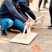 Die zufällig eingeteilten gemischten Gruppen dürfen sich nach Planung und Teamnamenfindung in unserem Teamhelden-Baumarkt mit Holz und Schrauben, aber auch ungewöhnlichen Gegenständen wie Suppenkellen und Nudelsieben eindecken, um den Kampf um das ausgefallenste und treffsicherste Katapult mit den anderen Teams aufzunehmen. Die erste Hürde lässt jedoch nicht lange auf sich warten: die Teams erhalten nur ein kleines Budget, um die besten Stücke im Baumarkt zu ergattern. Sollte das Taschengeld knapp werden, können Sie sich bei kleinen Challenges einen Zuschuss verdienen. Bewaffnet mit Hammer und Säge geht es nun an die Umsetzung. Unsere Coaches halten sich hilfsbereit in der näheren Umgebung auf.
